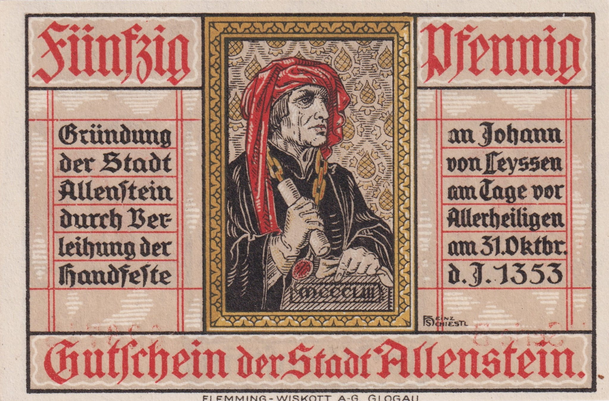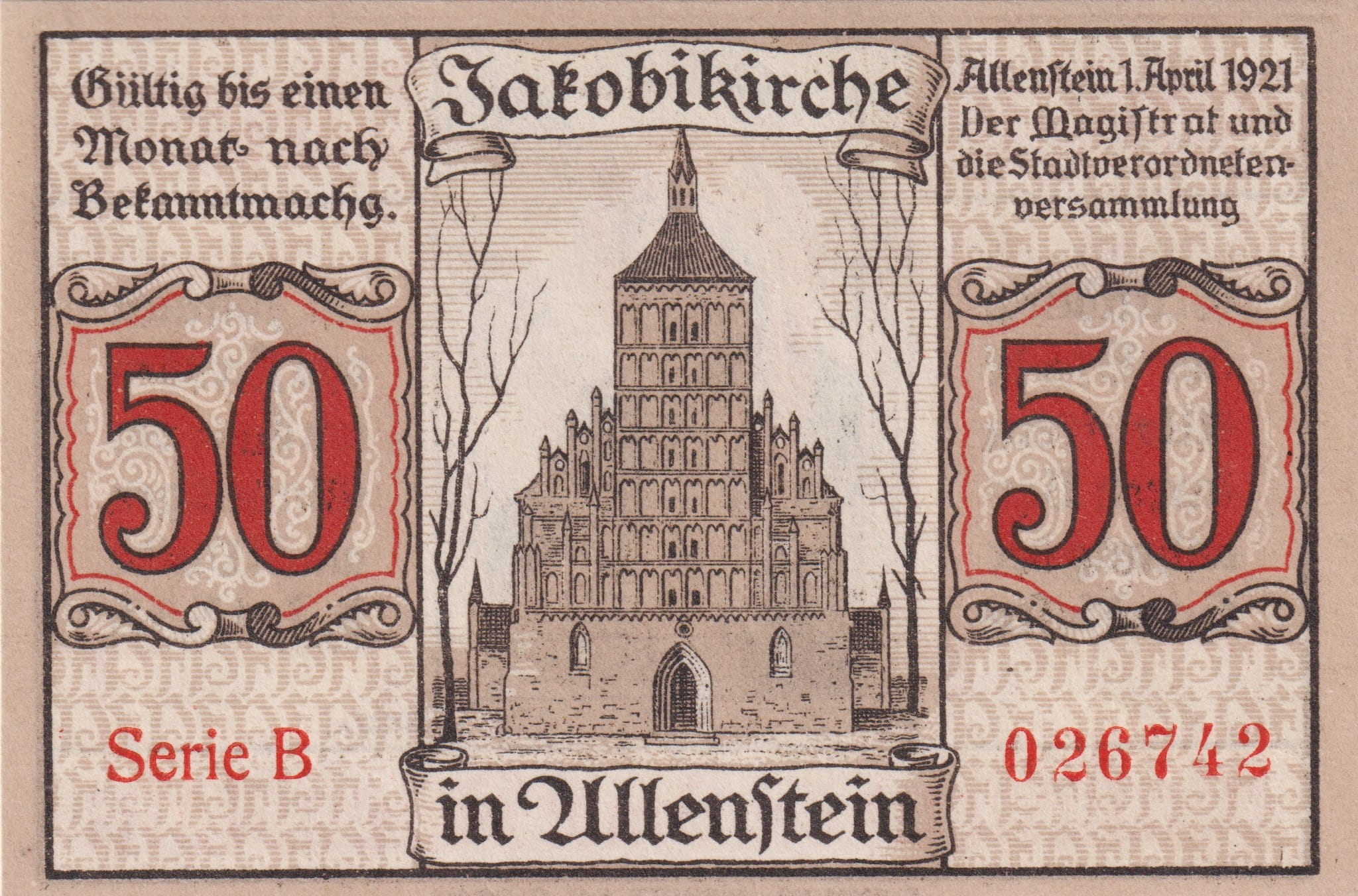 Allenstein (Olsztyn) 50 Pf G-13.2a 1.4.1921 UNC Rs. Jakobikirche