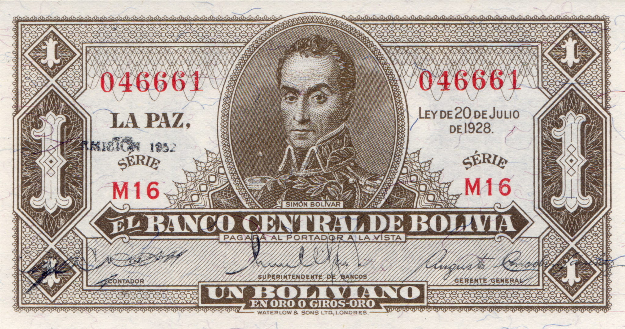Bolivia 1 Boliviano P-128 1952 AUNC