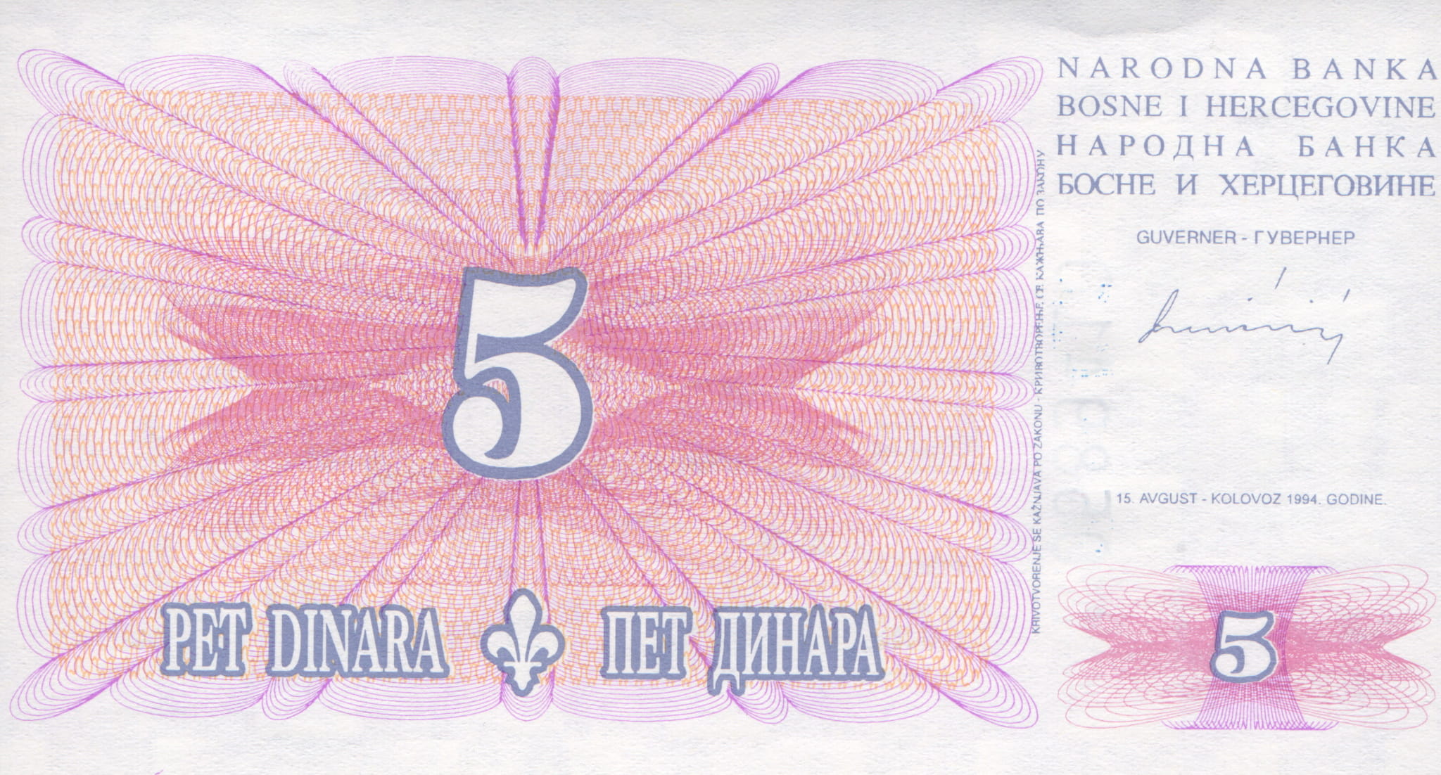 Bosnia and Herzegovina 5 Dinara P-40 1994 UNC