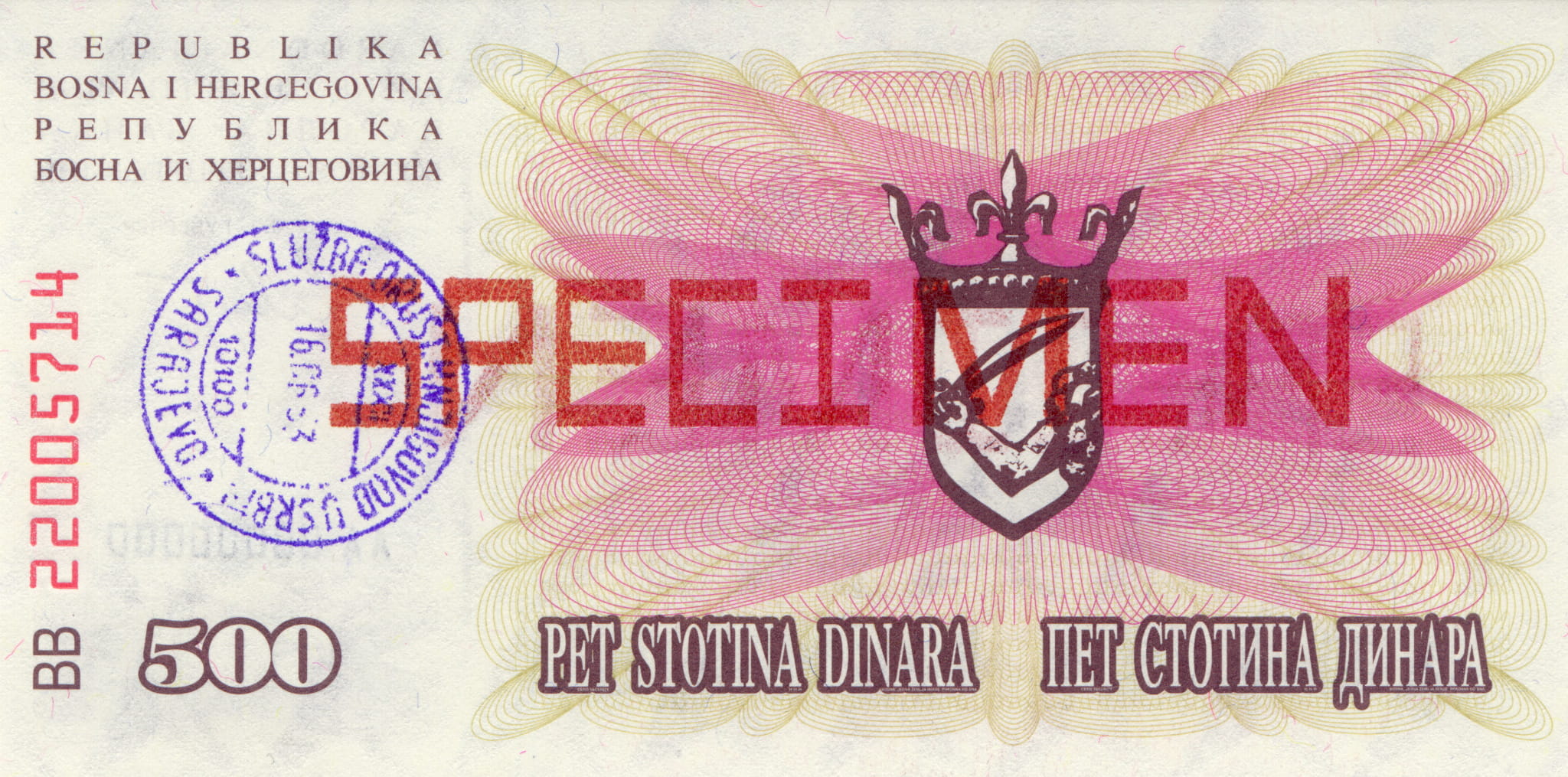 Bośnia i Hercegowina 500 Dinara P-14s SPECIMEN 1992 UNC