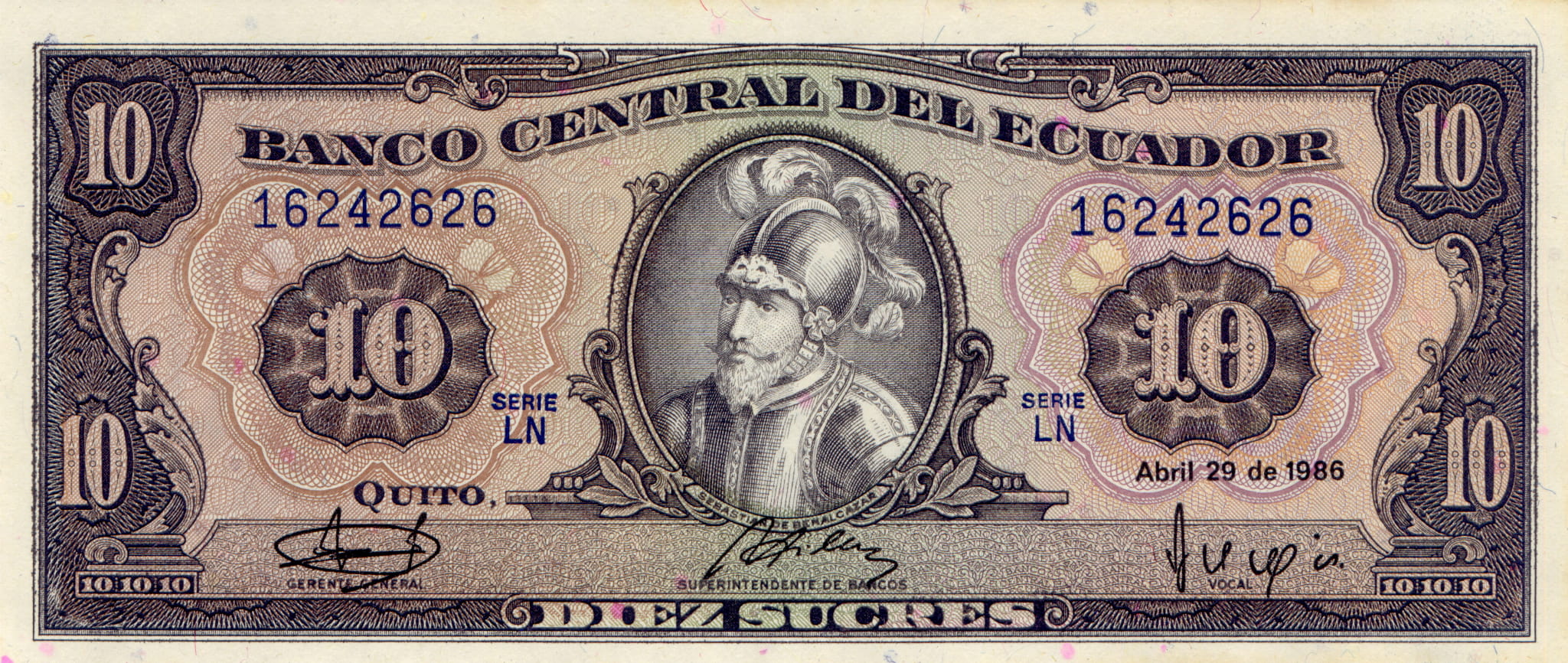 Ecuador 10 Sucres P-121 1986 AUNC