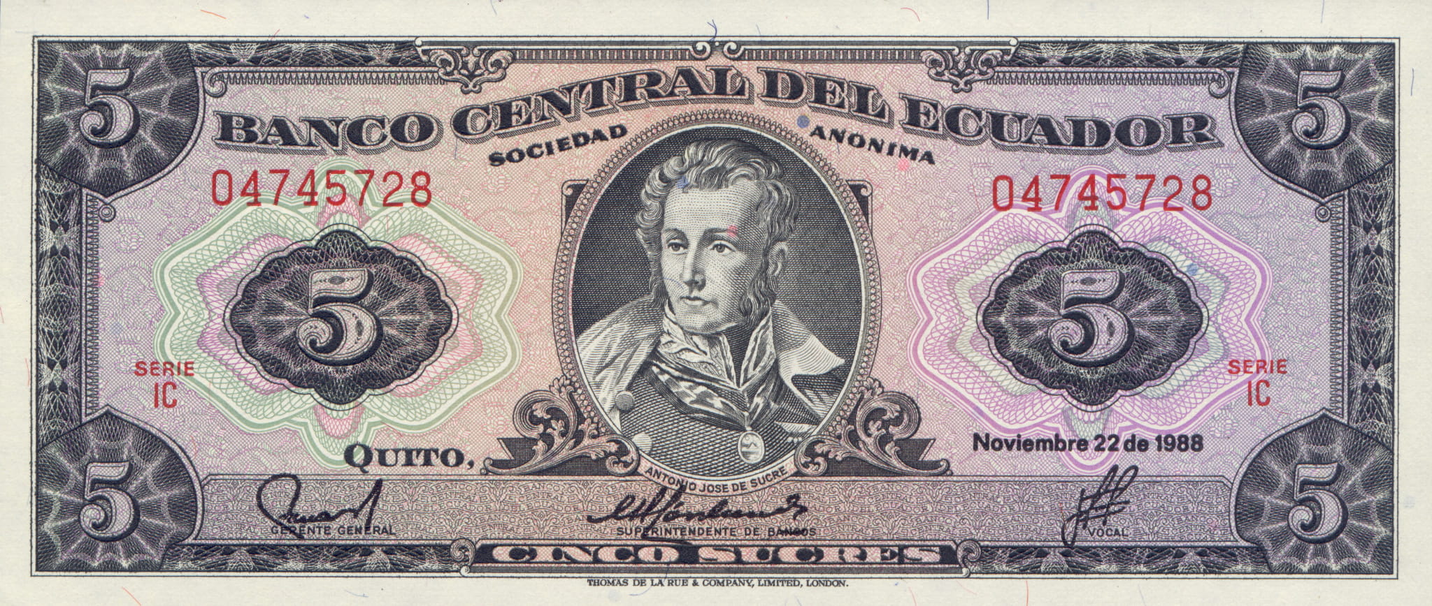 Ecuador 5 Sucres P-113 1988 UNC