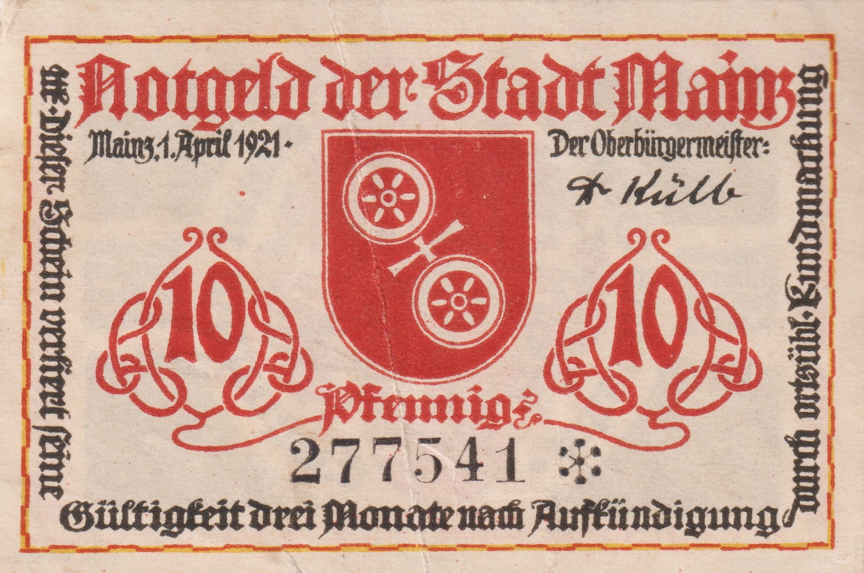 Mainz 10 Pf G-860.2a 1.4.1921 VF