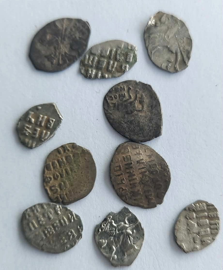 Rosja, Lot kopiejek-łezek - 10 sztuk, Moskwa.tan zachowania: 3/3+2/2- Rosja, Lot kopiejek-łezek - 10 sztuk, mennica Moskwa 3 mniejsze kopiejki Piotra I (z czasów samodzielnej władzy 1696-1717), trzy większe z czasów dwuwładzy Piotra I z Iwanem V (rok 1682), 3 sztuki Michała Romanowa i jedna dzienga Iwana Groźnego, wszystkie z Mennicy Moskiewskiej srebro, waga łączna 3,69 grama