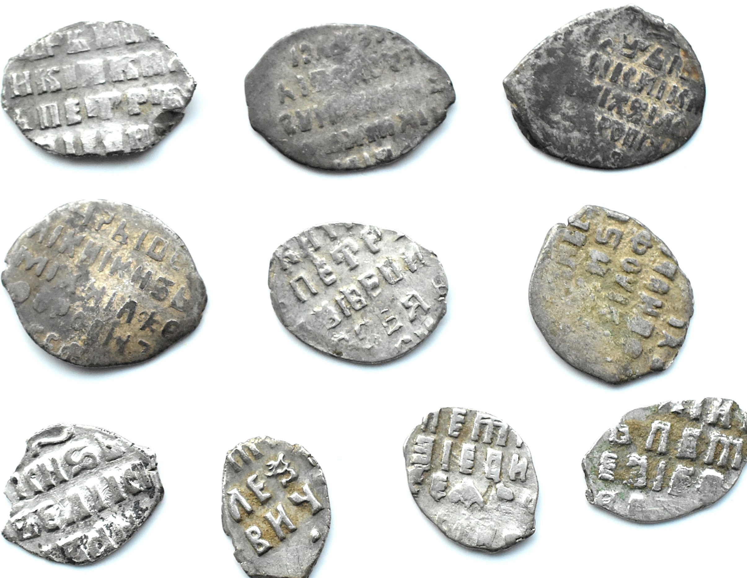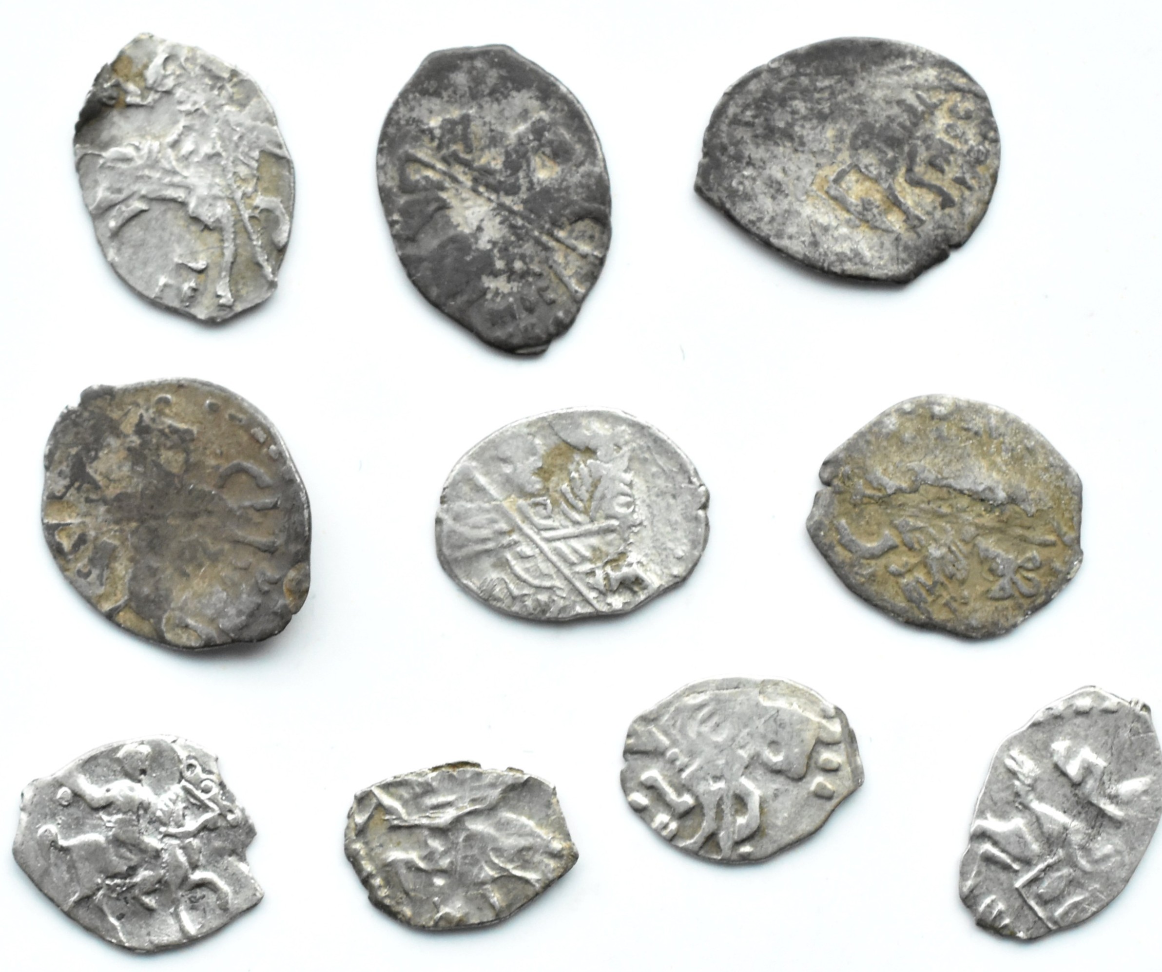 Rosja -Zestaw kopiejek-łezek - 10 sztuk, Moskwa Stan zachowania: 3/3+2/2- Rosja, Lot kopiejek-łezek - 10 sztuk, mennica Moskwa 3 mniejsze kopiejki Piotra I (z czasów samodzielnej władzy 1696-1717), trzy większe z czasów dwuwładzy Piotra I z Iwanem V (rok 1682), 3 sztuki Michała Romanowa i jedna dzienga Iwana Groźnego, wszystkie z Mennicy Moskiewskiej srebro, waga łączna 3,69 grama